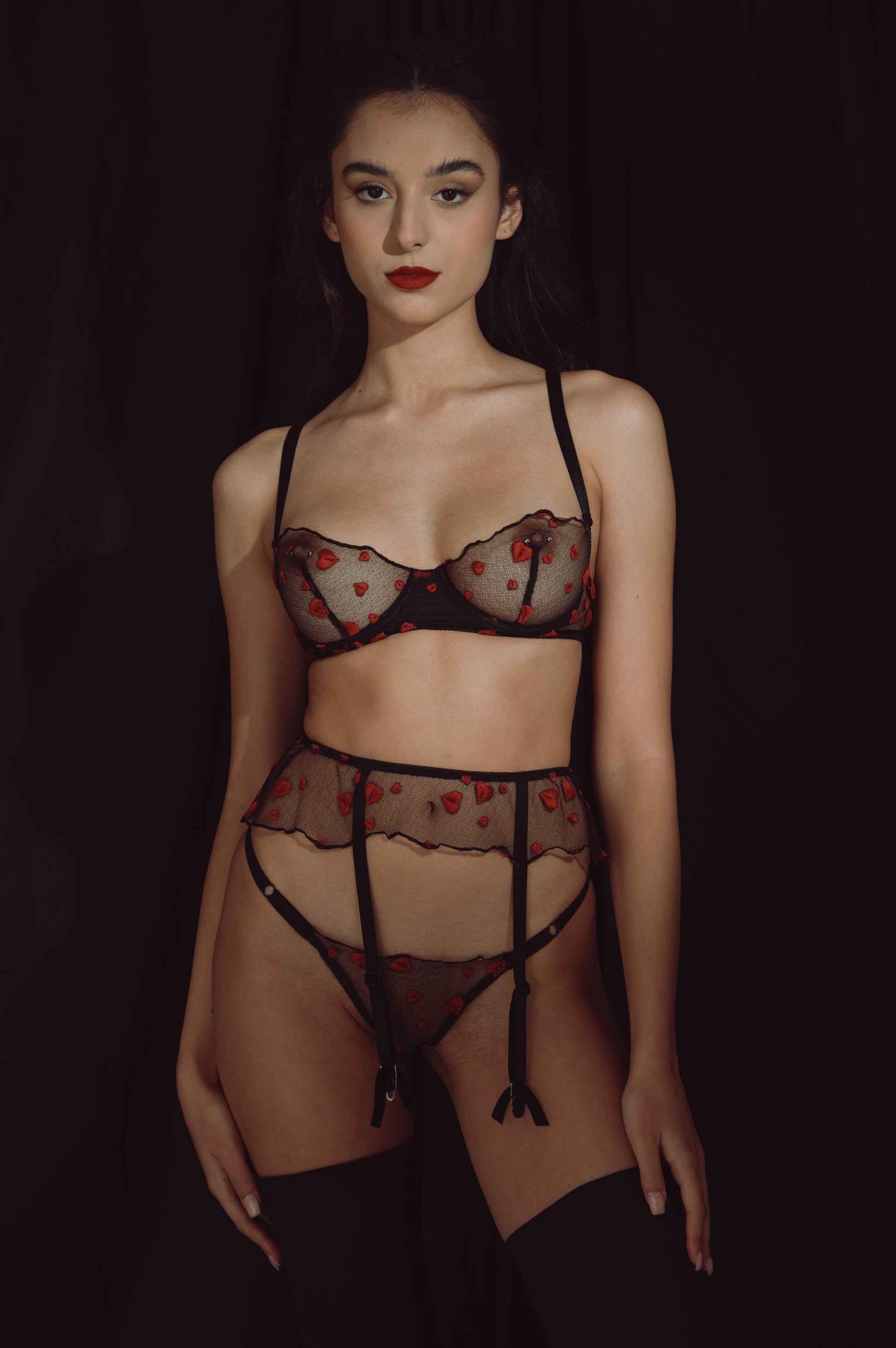 La Blessure est un soutien gorge adjustable, en tulle, brodé de petits coeurs rouges et de détails asymétriques.