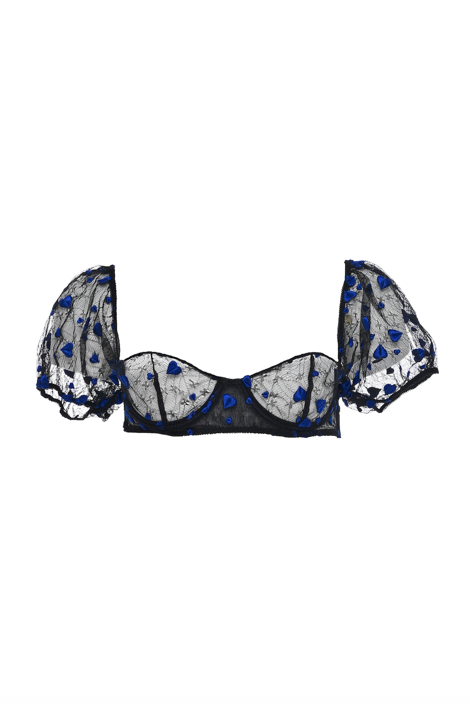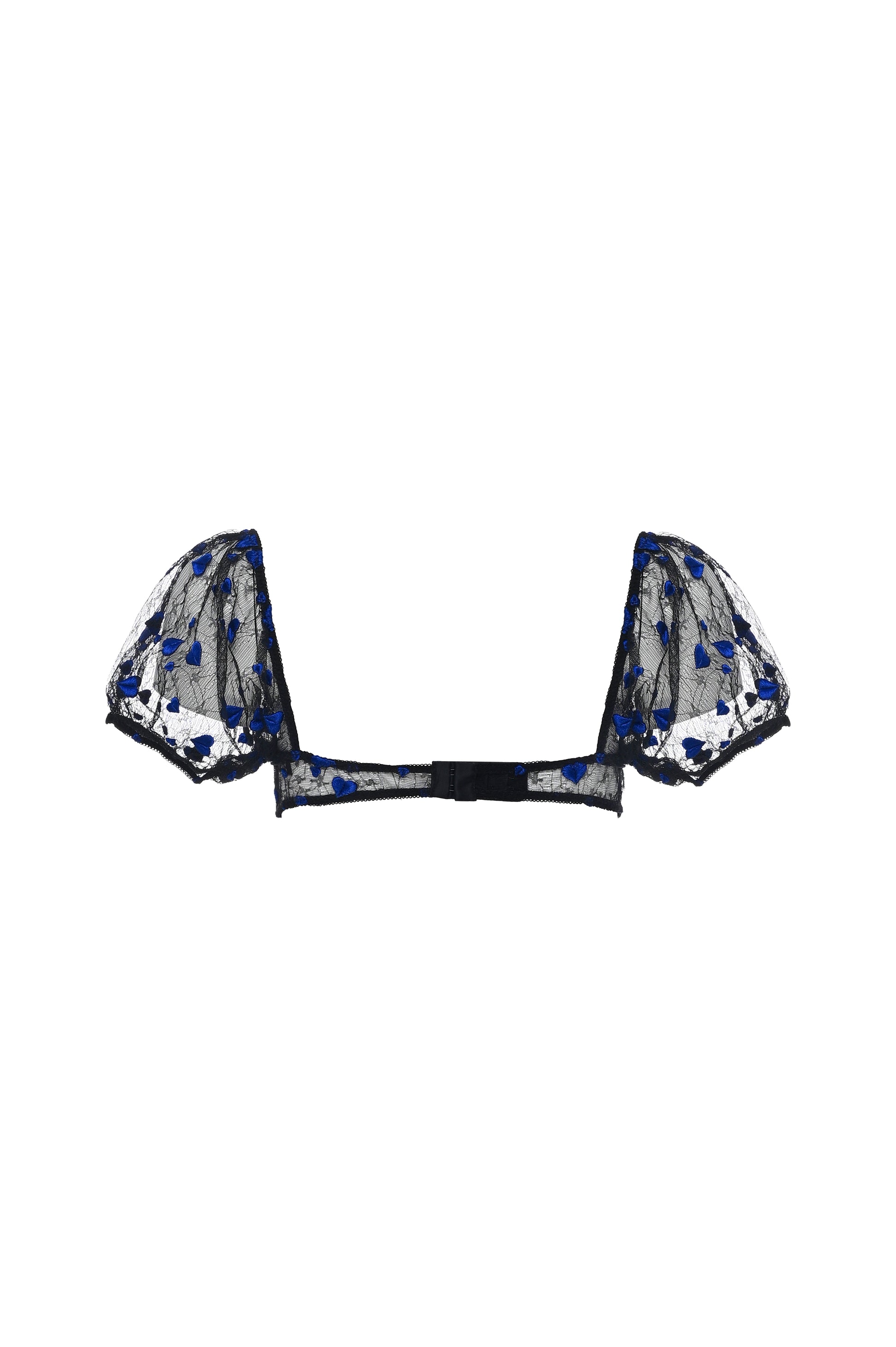 The Snow White bra is the best seller of the brand. Inspired from the fairy tale of Snow White, is made of embroidered lace with little royal bleu hearts. Is a part of the classic and iconic set of Odette, The Snow White.