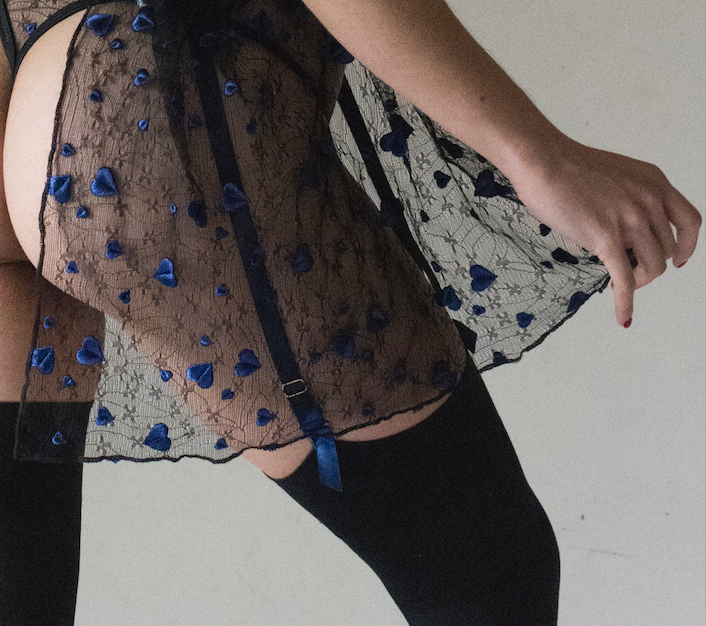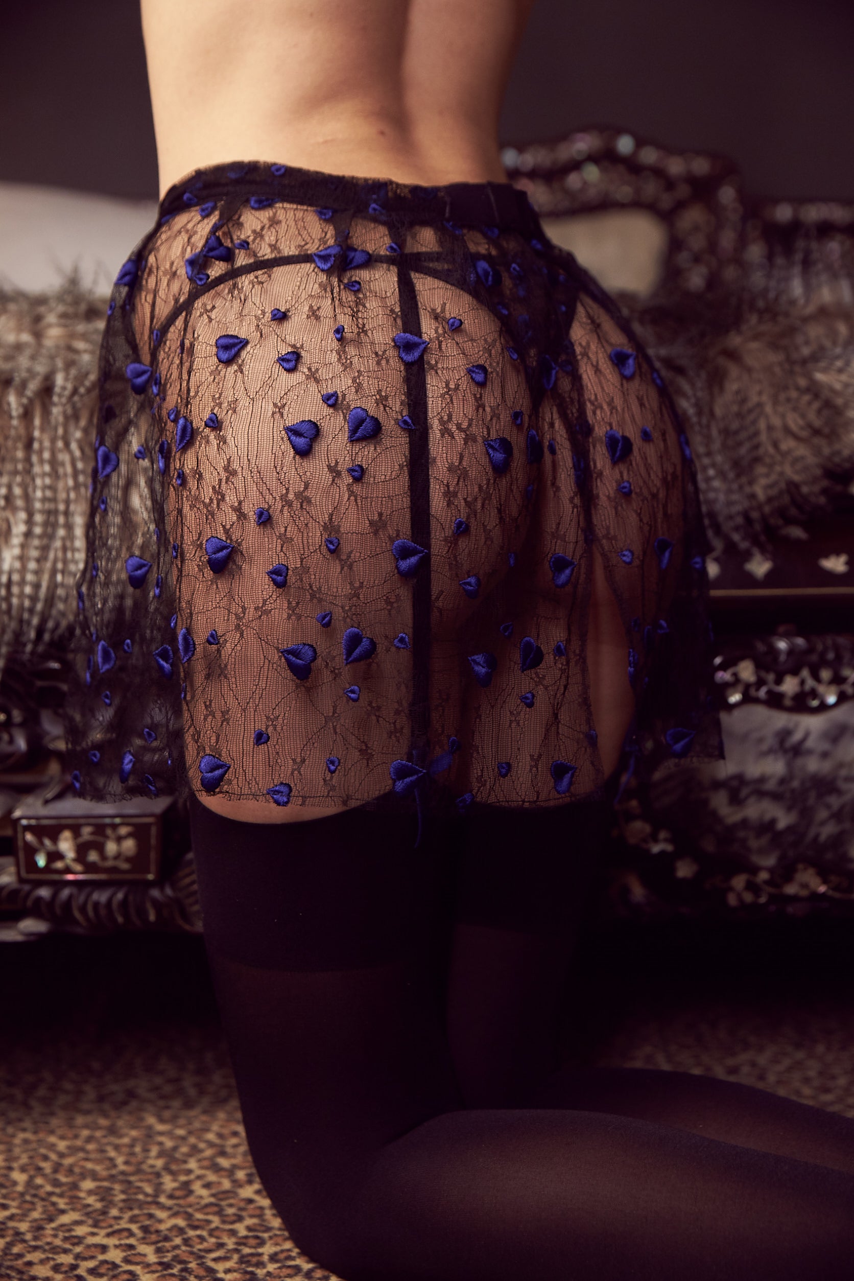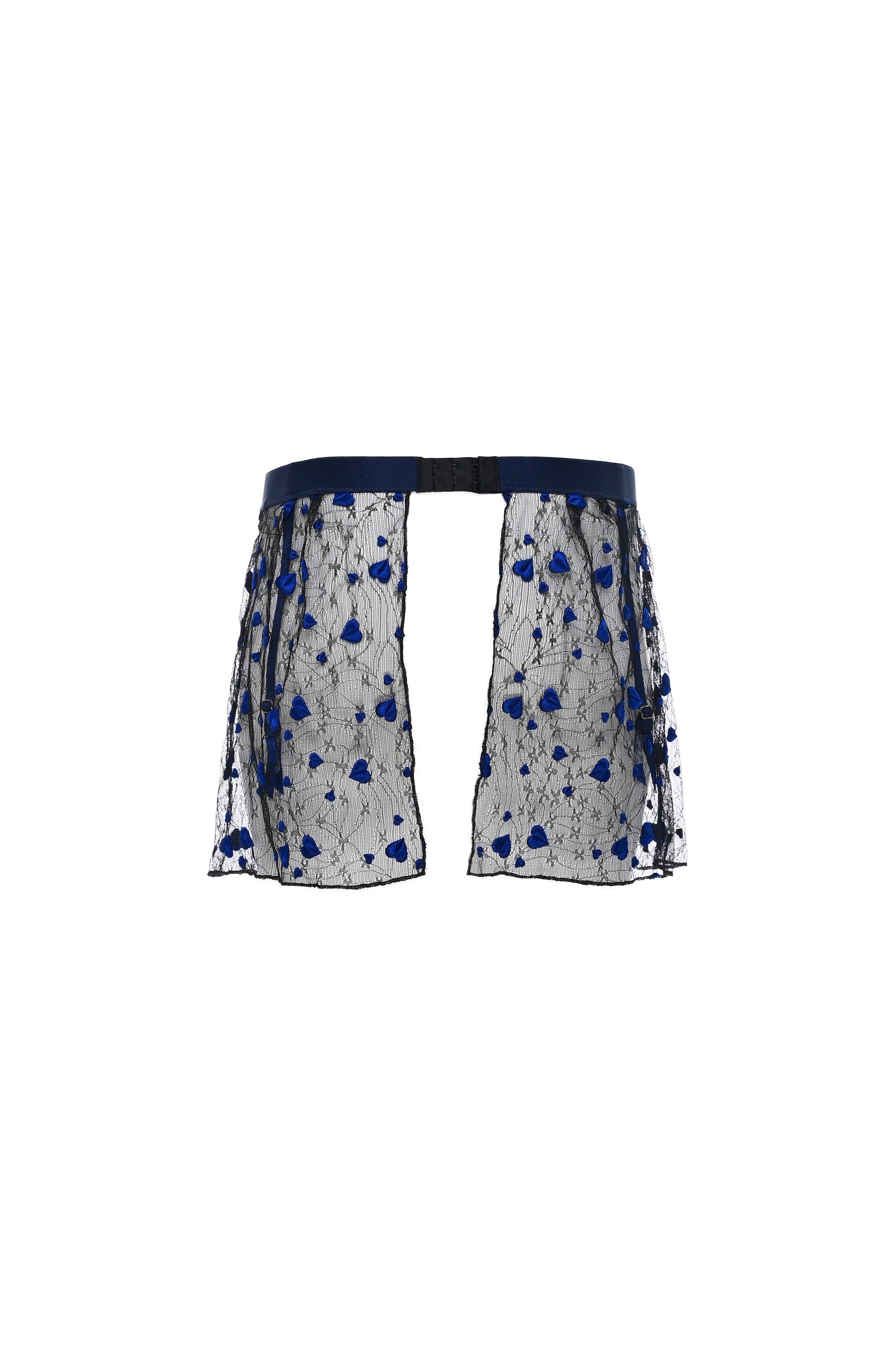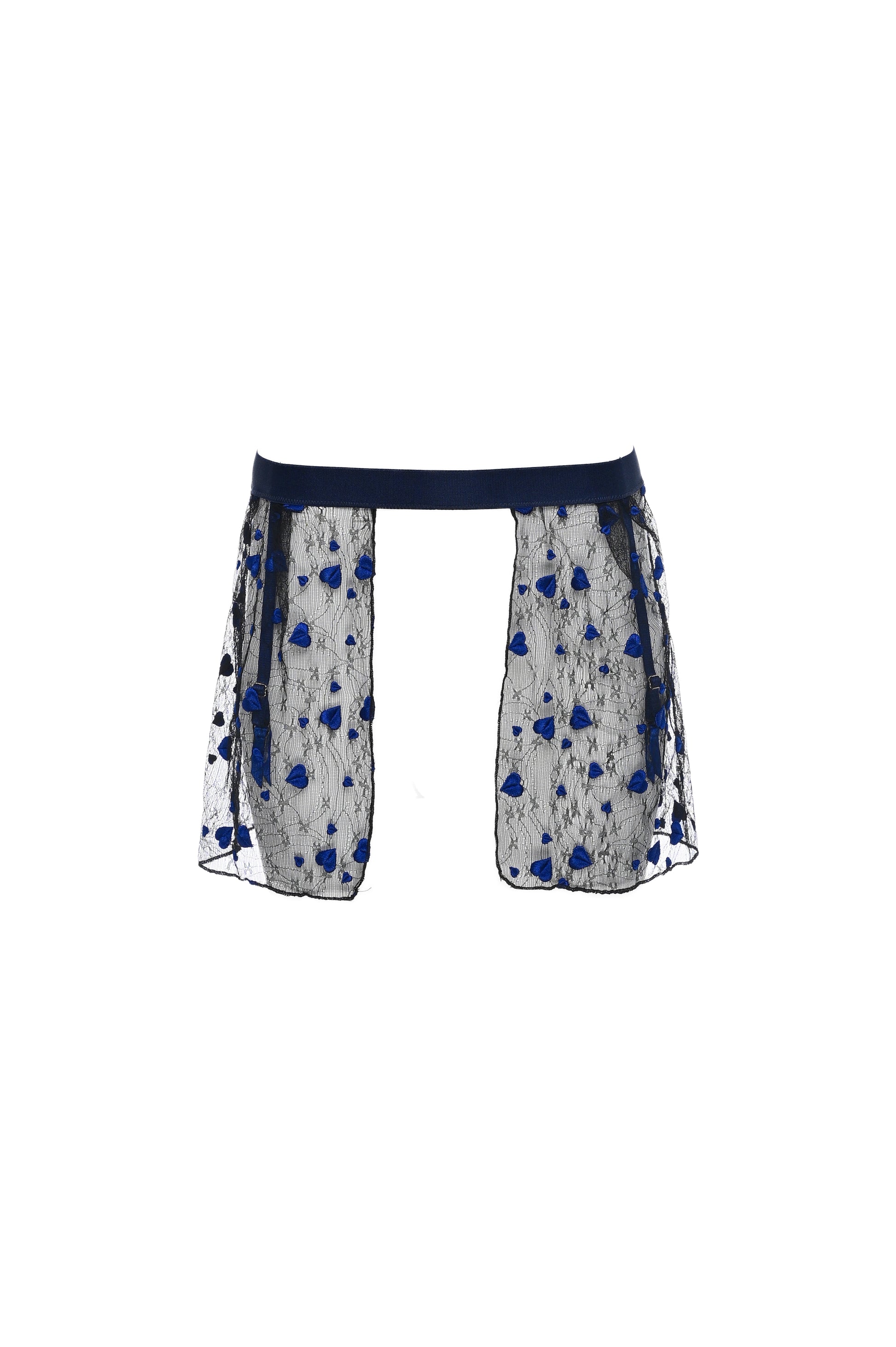 The Snow White suspenders is a little skirt in a shape of suspenders. Made of embroidered lace with little royal bleu hearts. Is a part of the classic and iconique set of Odette, The Snow White. The best seller of the brand.